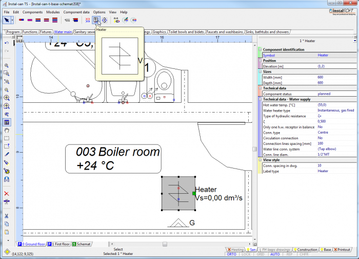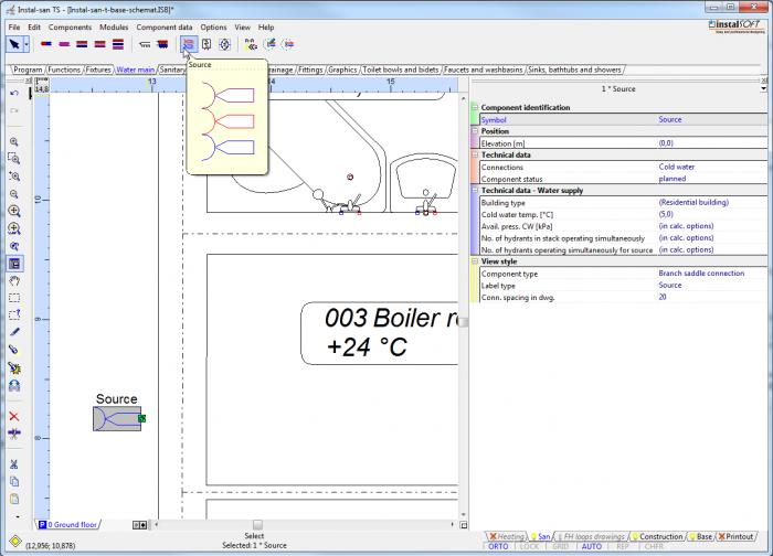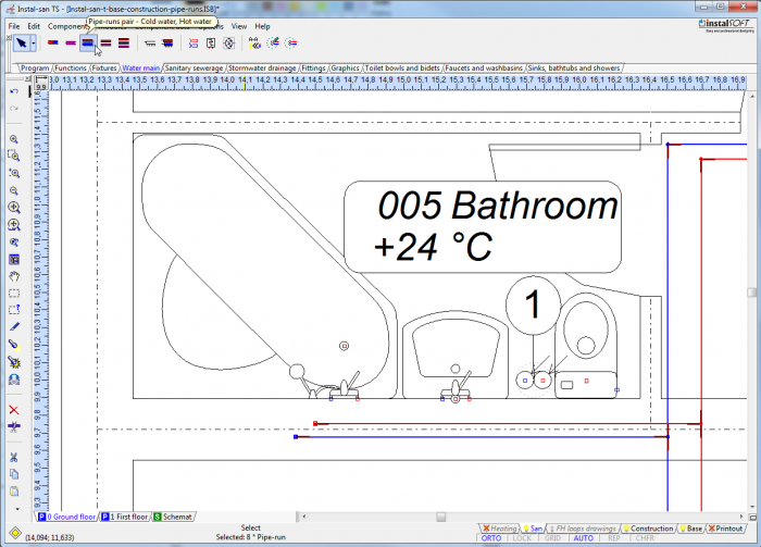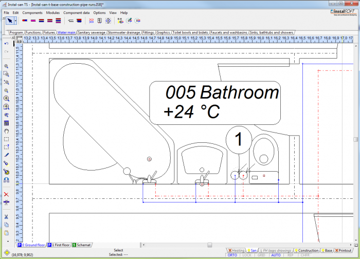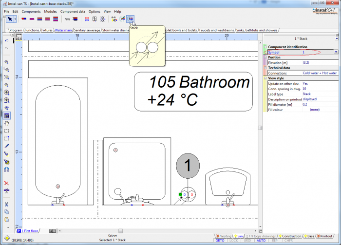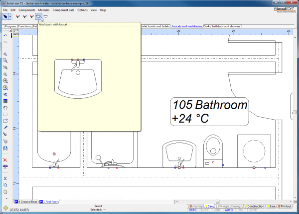 - From the toolbar, select the sanitary utensil in the basic variant and the tap in the basic variant.