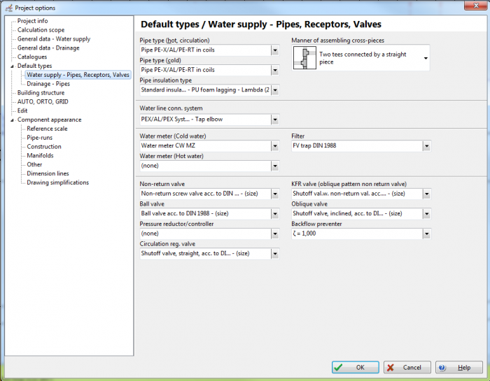 - "Default types" / "Water supply - Pipes, Receptors, Valves" and make changes, if expected data are different from the default data visible after starting the program.