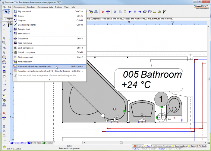 - Mark fragment of the system to include terminal units and pipe-runs to be connected, then press Shift+Ctrl+A or select "Automatically connect terminal units" in the Components menu.