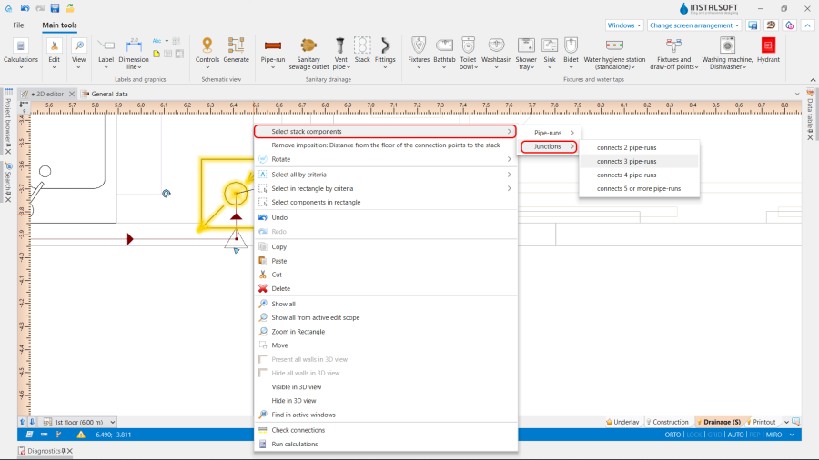 - Note: We recommend to define the value of Distance from the floor of the connection points to the stack to be used by default in the General data window for the usually lowest connection (e.g. for a Toilet bowl) and use another methods for the others.