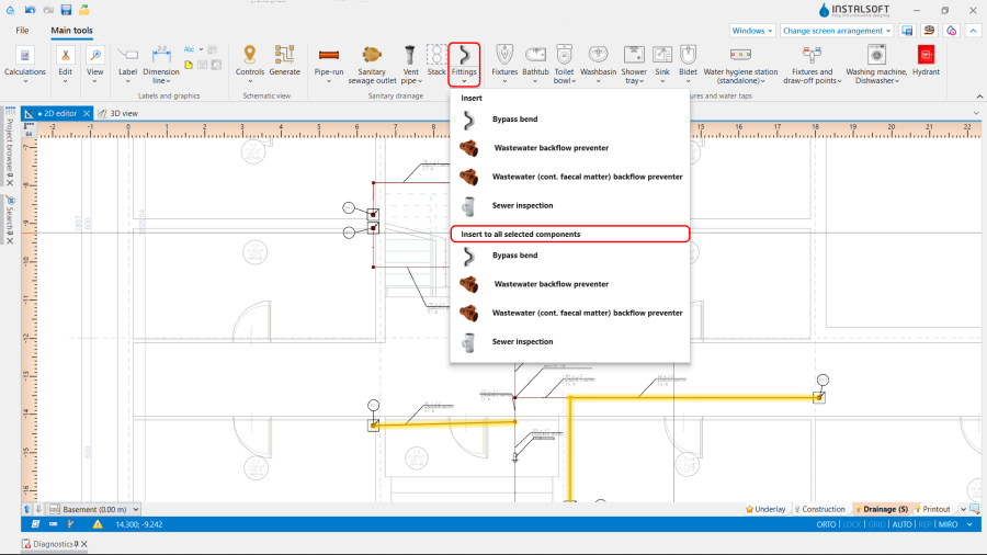 - Insert necessary Fittings in the 2D editor or on the 3D view, these may be elements such as Bypass bend, Wastewater backflow preventer, Sewer inspection and similiar.