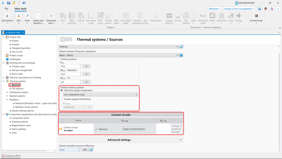 3. Carry out an interactive verification of results in the Interactive radiant systems calculations window.For more information, see: Interactive calculations of radiant systems.