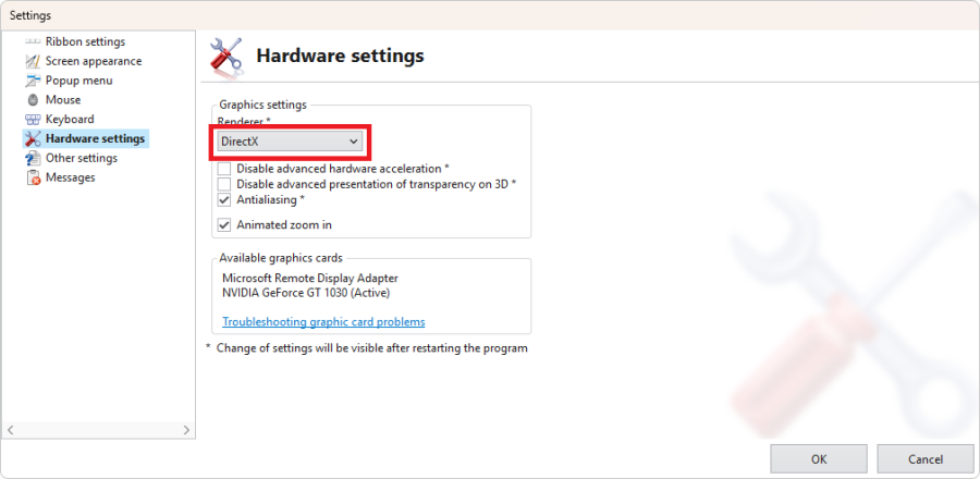 By default, the program uses the OpenGL graphics engine. However, on some graphics cards (e.g., Nvidia Quadro), new driver versions may cause the program to malfunction during startup or during graphical editing of a project. In some cases, the solution is to switch graphics rendering to DirectX, which can be done as follows:
