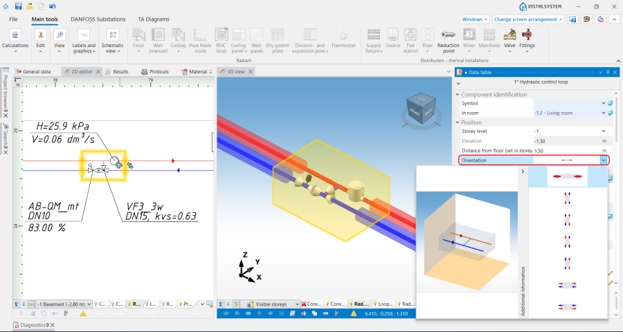 The Orientation of the Hydraulic control loop is selected in the Data table window from the available variants.