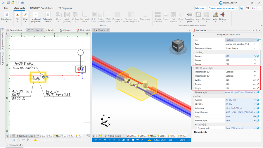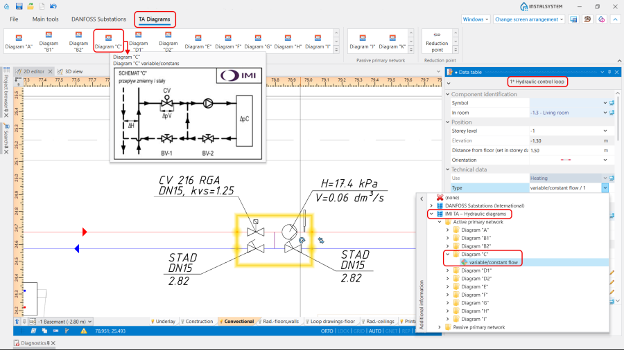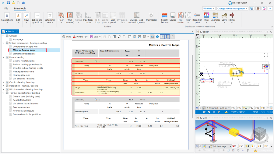 The Hydraulic control loop data is presented after performing Calculations of Heating systems/Cooling systems: