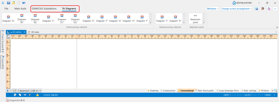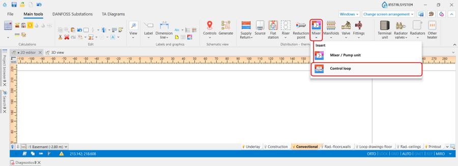 - clicking the icon Hydraulic control loop in the Distribution - thermal installations tab in the Main tools menu: