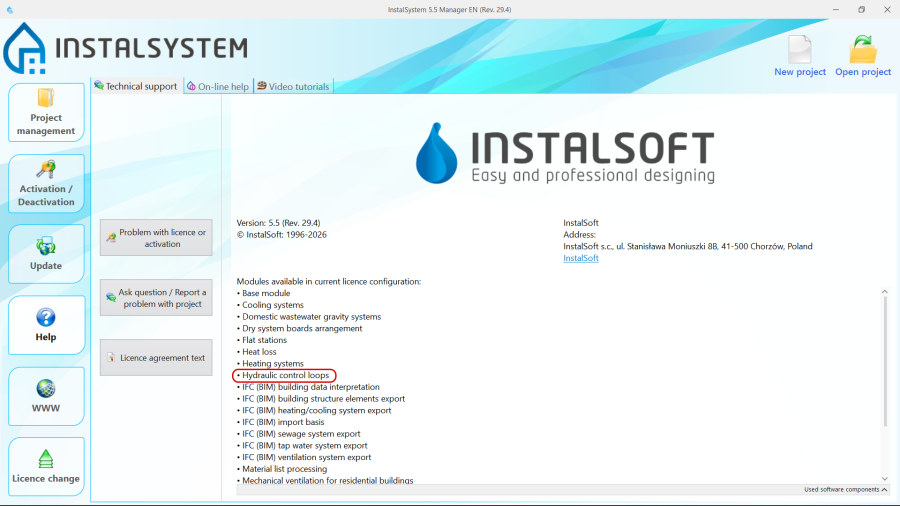 Hydraulic control loop is presented in the program as a separate module, the availability of which is visible in the InstalSystem 5.5 Manager / Help tab / list of Modules available in current licence configuration: