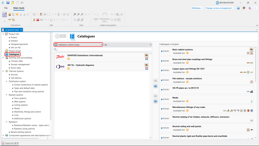To use the Hydraulic control loop element, the corresponding catalogues should be selected and added to the project in the General data window / Catalogues tab. For more information, see: Selecting catalogues for the project.