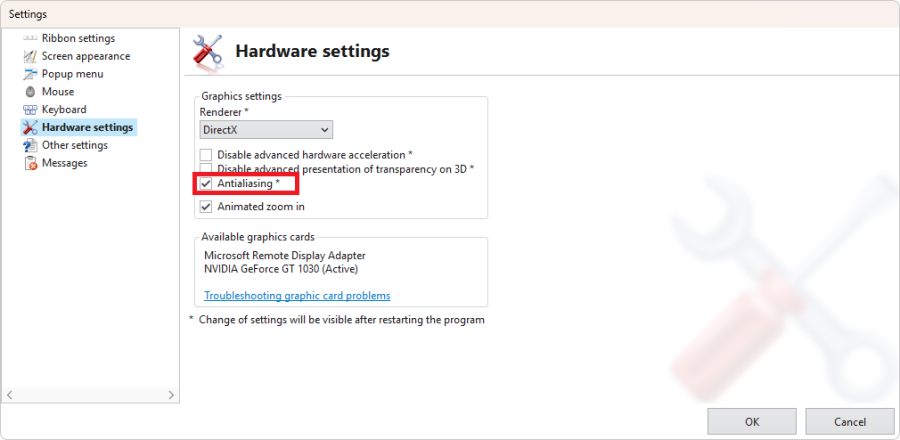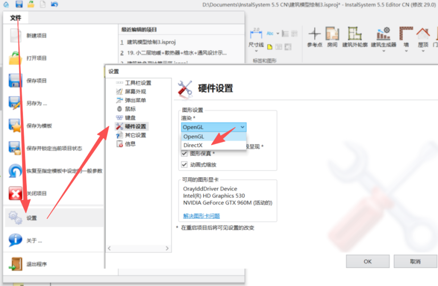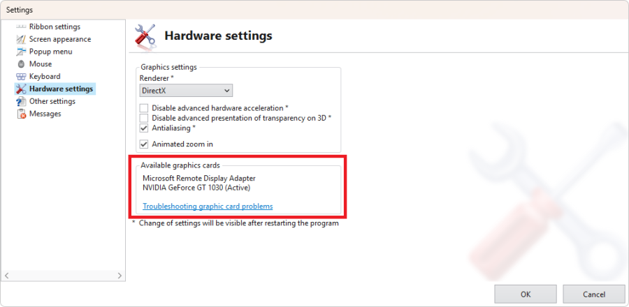 By default, the program uses the OpenGL graphics engine. However, on some graphics cards (e.g., Nvidia Quadro), new driver versions may cause the program to malfunction during startup or during graphical editing of a project. In some cases, the solution is to switch graphics rendering to DirectX, which can be done as follows: