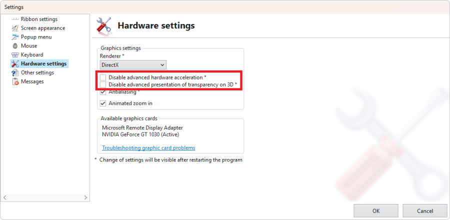 - Choose Disable advanced hardware acceleration and/or Disable advanced presentation of transparency on 3D and confirm your changes by pressing OK.