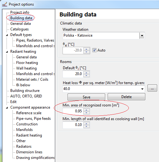 - Go to "Project options" and on tab "Building data" increase the minimum area of recognized room (it can be increased maximum to 2 m).