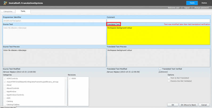 • It is possible to display identifiers of texts translated by the Translation System directly in the interface of the translated program (InstalSystem 5). Thanks to this, it is possible to get to know the context of using a given text, avoiding incorrect interpretation and translation. In order to display the identifiers in the program, follow these steps: