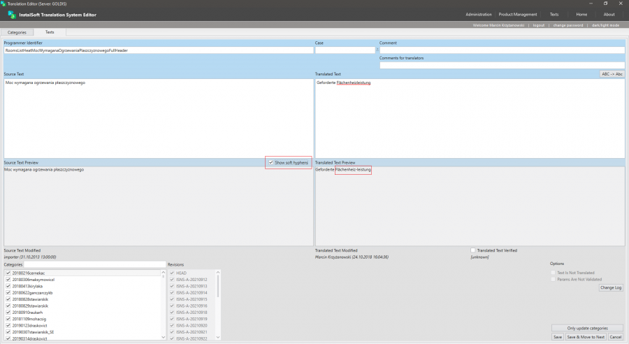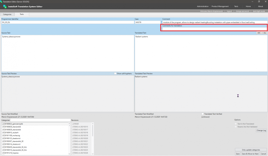 3. In the ‘Categories’ window you will see one or more categories, depending on the range of translations to be done. In the case of the need to translate missing/new texts this will usually be one particular category -need translation or review-.