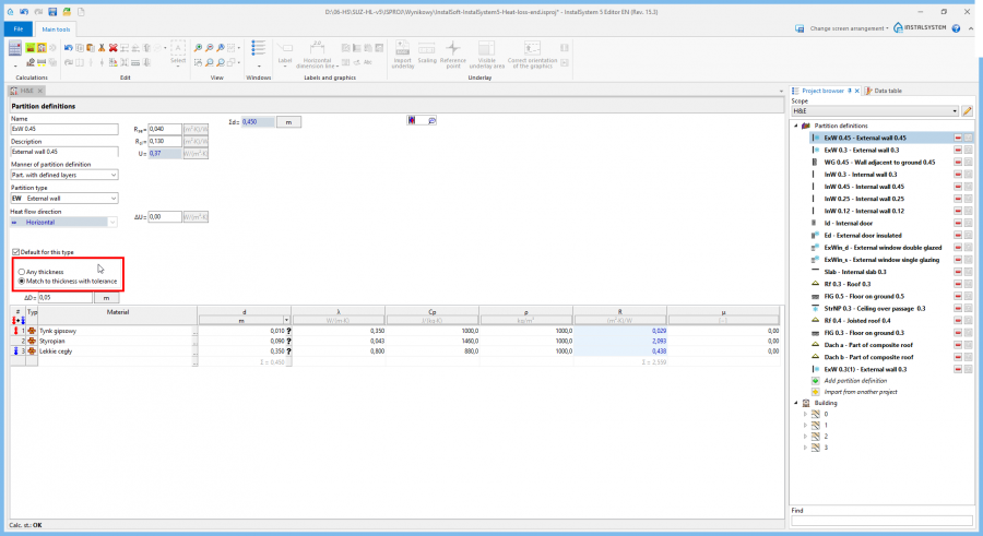 2. Zaimportować definicje przegród cieplnych z innego pliku .isproj. Jeżeli w bieżącej pracy będą potrzebne takie same definicje jak w innych projektach, można wykorzystać wcześniejsze pliki .isproj i zaimportować z nich definicje przegród do aktualnie realizowanego projektu.