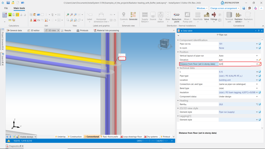 • for Convection heating and cooling systems (with no radiant components) and Water supply systems change Distance from floor (set in storey data)