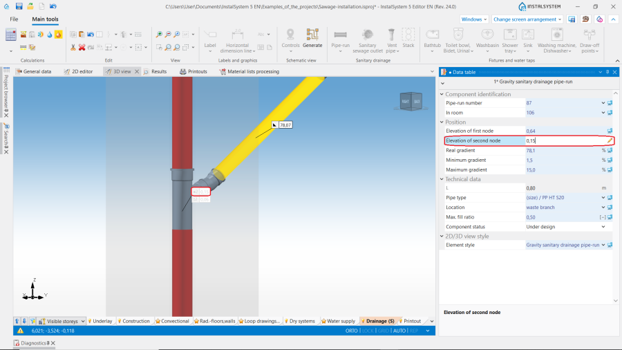 In multi-storey buildings, it can often happen that Drainage stacks should have a deviation (different XY coordinates) across different storeys, but should be considered as one, covering the entire height of the building. For such cases the following steps should be carried out: