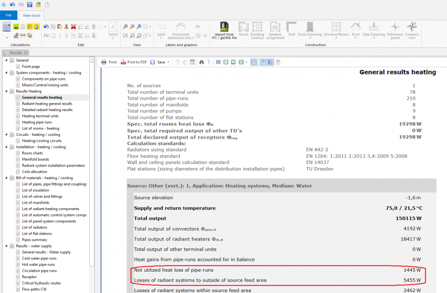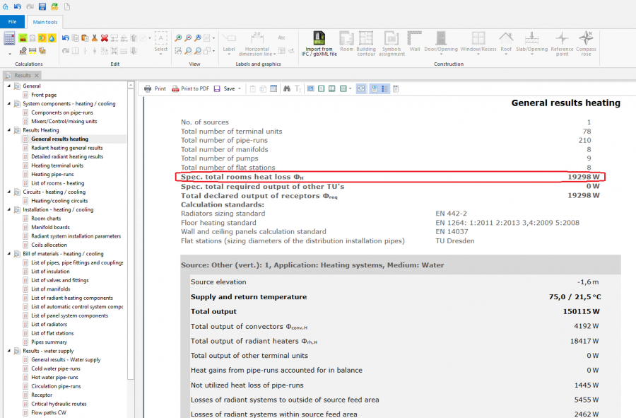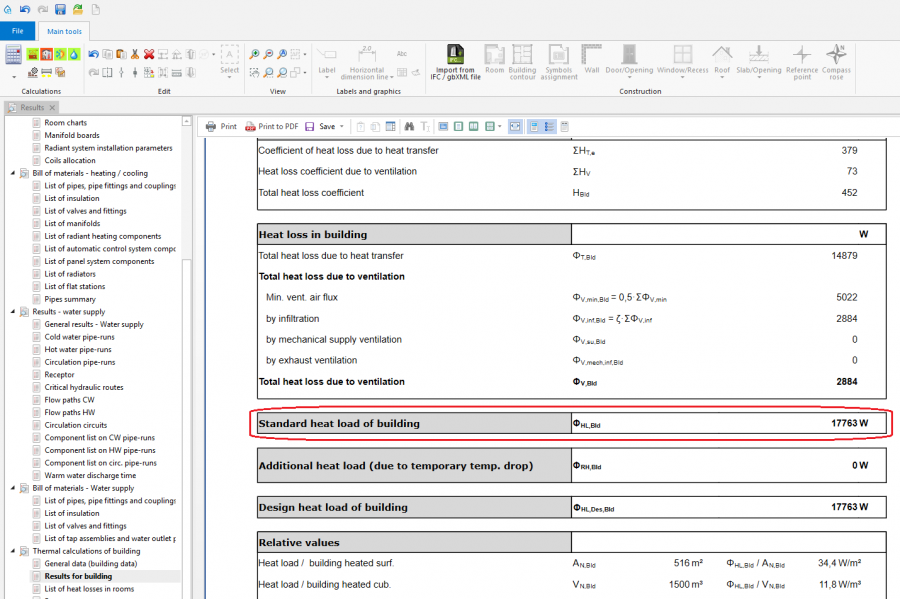2. Design heat load of building. - the total value of: Spec. total rooms heat loss ΦH, Not utilized heat loss of pipe-runs and Losses of radiant systems to outside of source feed area - in the case when thermal calculations of a building based on Calculated acc. to coefficient or User specified
